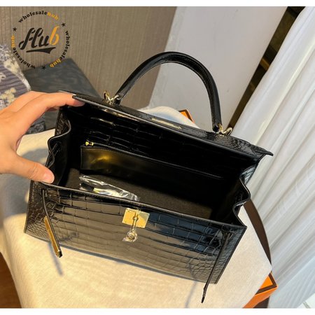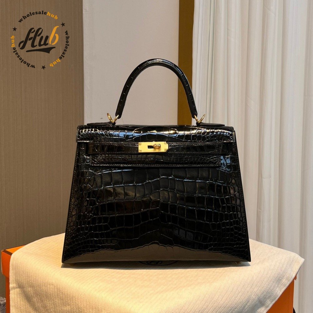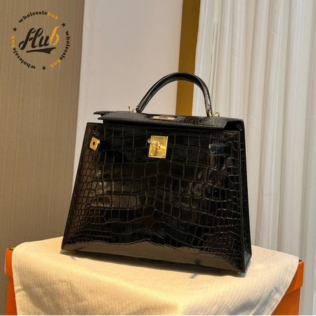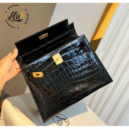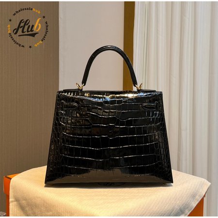 Hermes Kelly 25 HSS Sellier Black Shiny Alligator Brushed Gold Hardware